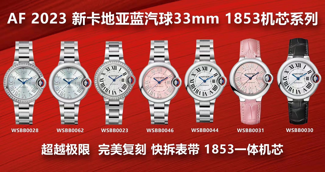 🌐AF创新神作33蓝汽球超级Cal.076机芯 AF卡地亚33mm蓝气球是复刻同款的唯一之选,原厂同源的表盘,指针,尖晶石把的等等配件,包括机芯刷新多项复刻记录,缔造蓝气球复刻神话. 1.表壳唯一一家做到厚度1.0与原装一致!最顶级蓝宝水晶镜面,月牙开口一模一样.(33蓝汽球系列是没有鱼眼效果,42,36,28才有鱼眼效果,知识点,需知道).瑞士级的精品打磨,壳和钢带和表扣,甚至是罗斯的细节等等都追求一致到位!全部可与原装正品手表零件互换!精细无比!也有进口高级美洲鳄鱼皮表带,多种色彩可选! 2.采用欧州原厂原装表盘,白色,粉色,大红,粉贝!真正是一模一样,高贵体现在于每一张面孔!瑞士原装烧钢蓝指针和真品尖晶宝石把头.每一样都不是国内厂家能做到的!整只腕表的气质与正品如出一辙.神韵如假包换,轻松做到秒杀市面任何仿品. 3.AF的品质追求,再次全面升级!独家采用超级Cal.076一体一档机芯,与正品一模一样,走时精准,品质优良!开盖验机芯,都很难辩识真假!超值之选! AF卡地亚,内外双修,做到极致,只为给你一个精品的蓝汽球! 买蓝汽球,认准AF! AF出品卡地亚,颠覆你的想象.^_^
