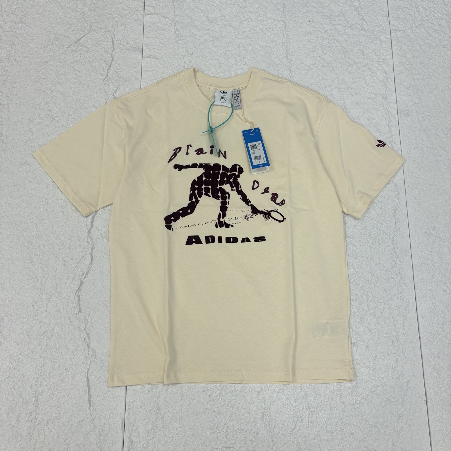 adidas originals x Brain Dead脑死亡联名款 SS25 flocked-logo植绒图案绣花字母圆领宽松短袖T恤 首发毒原版购入 adidas Originals 与洛杉矶品牌 Brain Dead 再度携手,推出2025 春夏合作系列. 本季系列以网球运动为灵感,以焕新视角演绎 adidas 经典鞋款 Forest Hills. 继去年双方推出 StanSmith 联名鞋款后,Brain Dead 再次带来突破传统的创意表达,将大胆设计与品牌标志性美学注入 adidas 经典款式之中. 230g 双纱布料亲肤舒适,经过批布预缩处理,人物图案及阴影植绒印花,采用环保浆料打底,经静电植绒技术将超细纤维垂直植入,指尖拂过时呈现猫舌纹般的微妙触感,每平方厘米超两万根绒毛构成浮雕式图案,比传统丝印耐磨度高三倍. 植绒人物上方和袖口 logo 采用进口绣花,紧密饱满有质感.辅料均为原开模定制. adidas