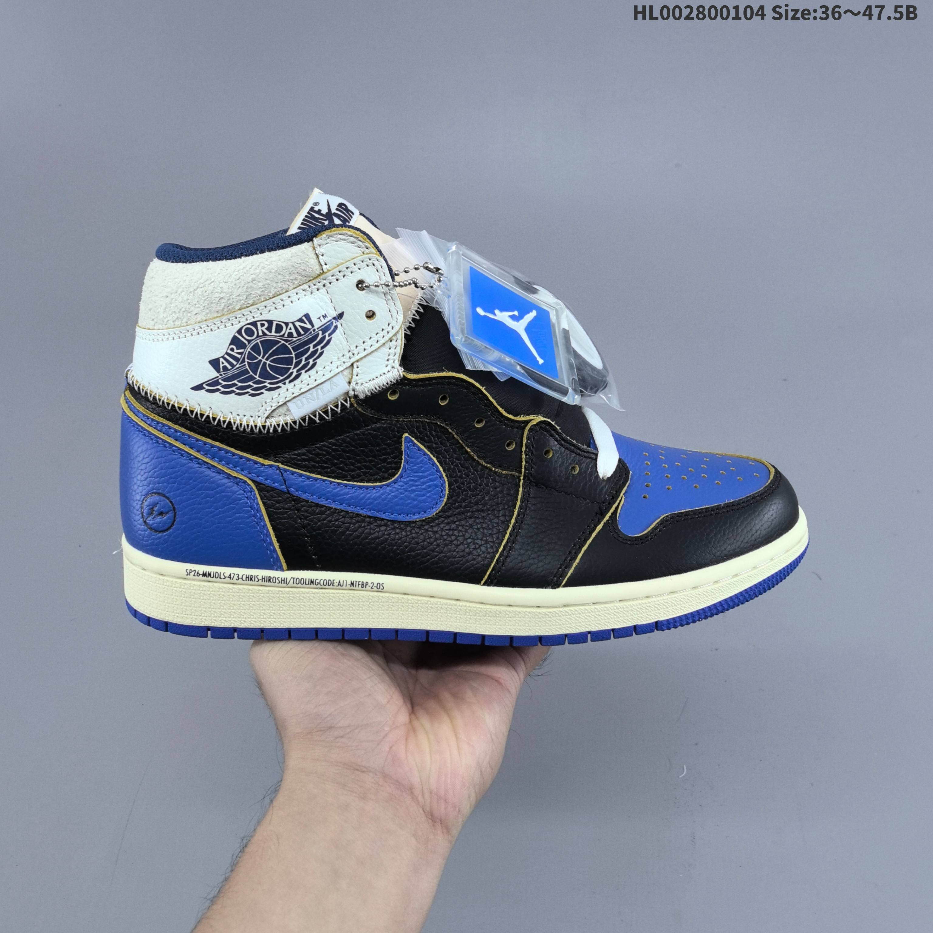 💰180 头层带半码 Union x Fragment Design x Air Jordan 1 Retro High OG 高帮 藤原浩黑白蓝拼接 AJ1 乔丹1代 aj1 乔1 高邦 黑白蓝拼接 乔丹篮球鞋系列 鞋身主体来自经典藤原浩的黑白蓝配色,白色皮革鞋身搭配蓝色框架覆盖层,鞋身两侧Swoosh Logo以黑色点缀,鞋舌绣标上以蓝色Nike Swoosxh Logo呈现,而鞋帮及后跟处则来自更受欢迎的皇家蓝配色,Wings Logoc采用黑色呈现,后跟侧下方印有经典藤原浩闪电Logo,中间使用粗犷的缝纫方式连接,气质独特值得玩味。皮革截面以黑色呈现,复古气息油然而生,同时还有鞋舌等多处细节均来自元年版本;鞋帮处带有“UN/LA”字体标签,彰显联名身份。 货号:IO7847-001 尺码:36 36.5 37.5 38 38.5 39 40 40.5 41 42 42.5 43 44 44.5 45 46 47.5HLB321800103 Size:36~47B