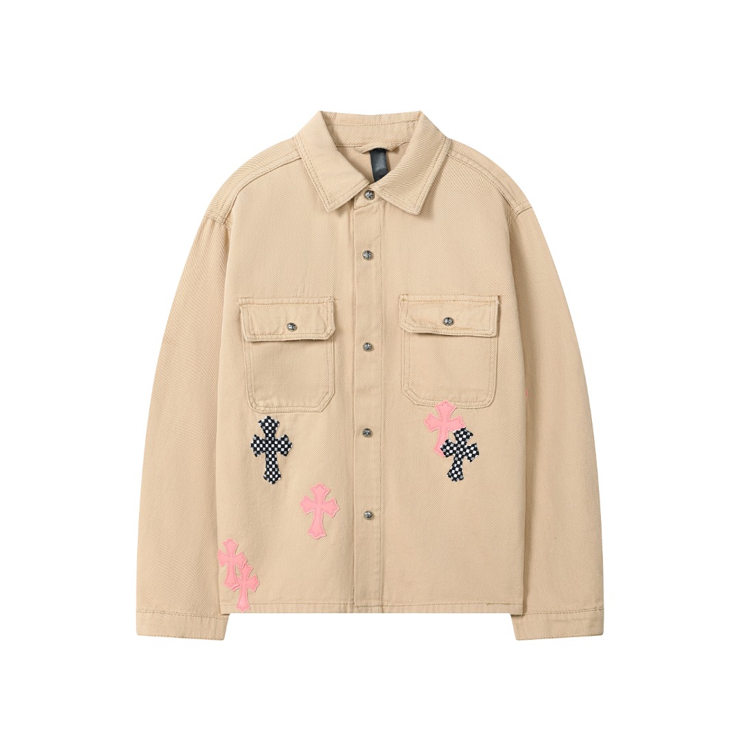 💰300 高版本Chrome Hearts克罗心 卡其色皮标十字牛仔外套,男女同款。虞书欣同款 粉色十字形拼皮太吸睛了,还有棋盘格元素点缀,甜酷风直接拉满,设计感爆棚。采用重磅粗支纱100%牛仔棉面料重工水洗,在保证版型挺括硬朗的同时亲肤舒适透气,克罗心当家银饰细节,尽显奢华!休闲宽松版型,慵懒随意,男女同款 尺码:S-XL