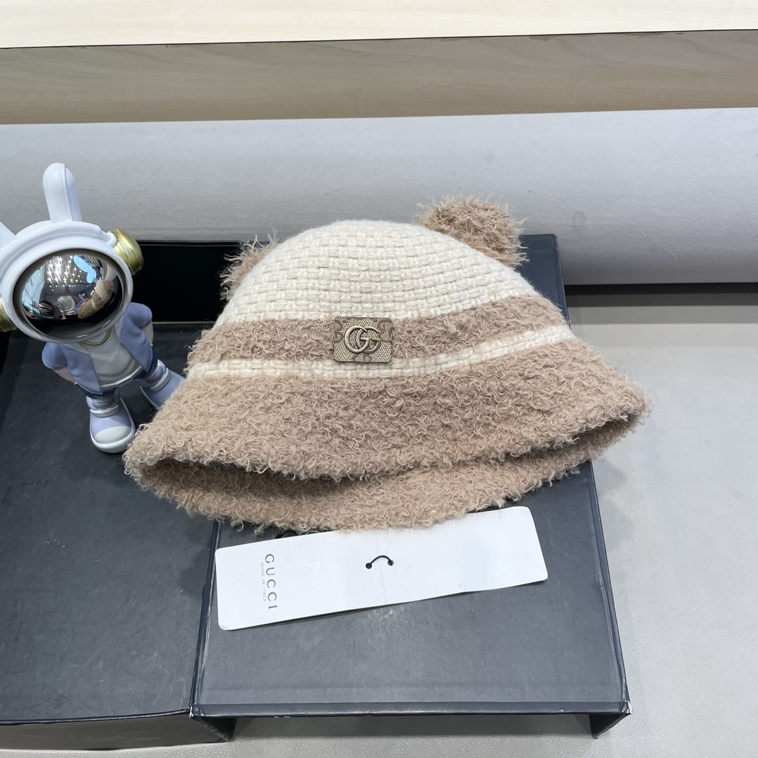 Gucci羊羔毛渔夫帽女秋冬可爱小熊耳朵户外保暖防风抗寒盆帽新款显脸小