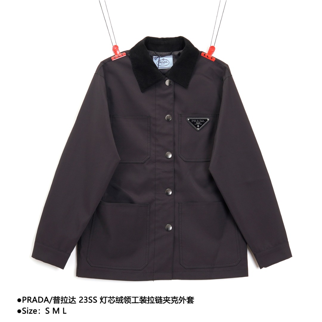 💰350 PRADA/普拉达 23SS 灯芯绒领工装拉链夹克外套 Size:S M L 原版澳门国专16500mop购入,面料采用320克36D超细再生棉材质,定织丝绸里布,定织灯芯绒领面布,定制新款三角标,定制20mm四合扣(门禁×5.袖口×2)定制黑色logo大号防尘袋,定制辅料 款式编号:A-5605605636