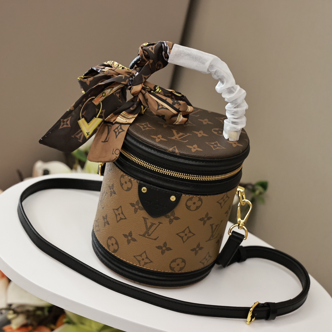 LV圆筒包 高端版本💰260 礼盒配丝巾. 借鉴历史悠久的LV Cannes化妆箱造型.女装艺术总监Nicolas Ghesquière以此款半硬质手袋重现昔日经典的魅力.由Monogram与Monogram Reverse涂层帆布混合面料.充满路易威登传统特色的外观设计.十分雅致.配有顶部手柄和可脱卸皮革肩带.提供多种背携方式. 规格:17*15*15cm