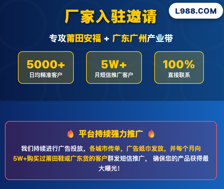 988货源 - L988货源网(原共享货源网)专注于汇集莆田安福、广东鞋服产业资源的导航网站,提供丰富多样的鞋类与服装产品,包括但不限于莆田鞋,运动鞋、休闲鞋、时尚服饰等热门产品展示,精准查找商家和产品,享受一手货源的优势